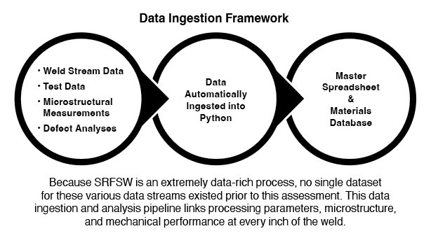 • Integrated Data-Ingestion Framework: SRFSW is a complex process with many interacting variables. The weld process produces a large amount of data with diverse data types that include dozens of tabular process parameters, dozens of sequential data streams from the production tool, fracture and weld cross-section images, and mechanical-test lab data. A Python-based framework was developed to automatically ingest and validate these diverse data and compile them into a single master spreadsheet and a database. This tool reduced manual effort, minimized transcription errors, and improved data quality for downstream analysis. The team delivered the tool to stakeholders for their ongoing use.
