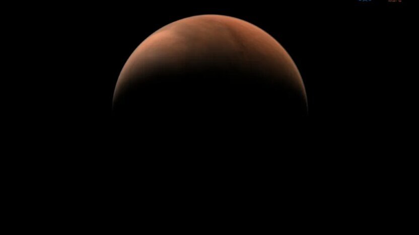 A high-resolution image of Mars taken by China's Tianwen-1 spacecraft, showing a partially illuminated view of the planet’s northern hemisphere against the darkness of space. The reddish-brown Martian surface is visible with subtle atmospheric haze.